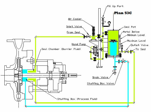 In Plan 53C (M) we replaced the piston type accumulator with Metal Bellow Tracker. The bellow tracker eliminates the use of ‘O’ Ring which causes the sluggish movement of the piston. Plan 53C (M) is a dual pressurized system that eliminates the use of Nitrogen for pressurization with the help of a Metal Bellow Tracker. Barrier liquid is stored on the topside of the Metal Bellow Tracker. The reference line from Stuffing Box is connected to the bottom of the Bellow Tracker. The Metal Bellow Tracker is designed in such a way that it responds to even a 0.1 kg/cm2 change in pressure (with the help of initial pressure provided by spring action and differential pressure created by of Bellow Tracker).