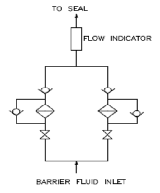 Both filters have a bult-in, automatic by-pass valve. This valve will open when the pressure difference exceeds 35 PSI (2,5 bars). This will prevent the possibility flow reduction to the mechanical seals. |